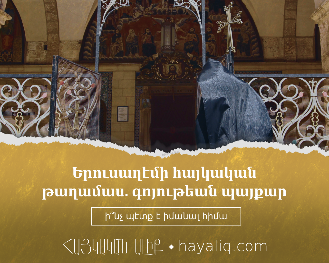 Երուսաղէմի հայ համայնքը այսօր կ՚ապրի իր 16 դարեայ պատմութեան ամենէն աղէտալի պահերէն մէկը։ Պատճառը՝ Հայկական Թաղամասի մէկ մասը յանձնելու պայմանագիրի գոյութիւնը։