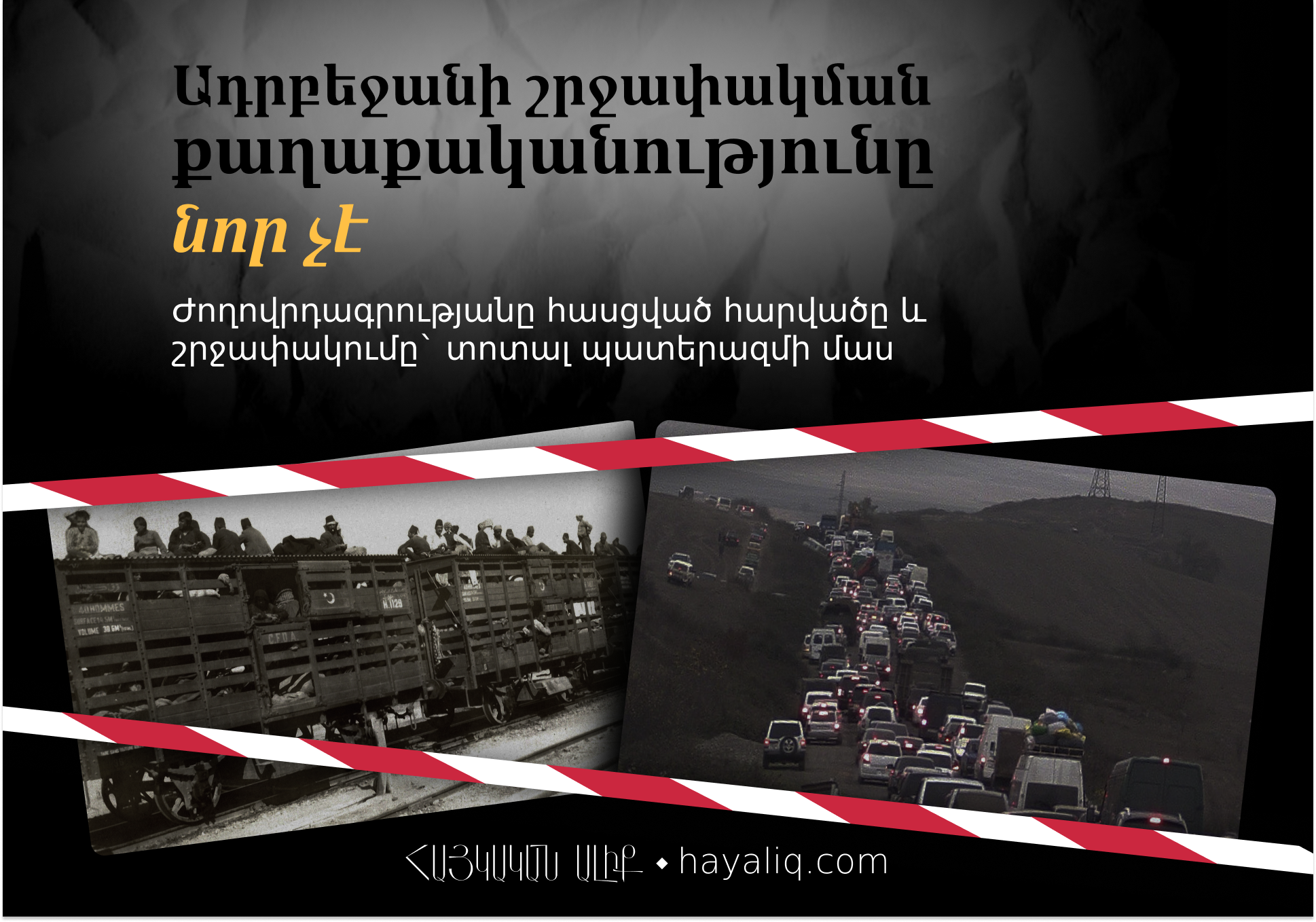 1915-1922 թթ. անատոլիական և ադրբեջանական թուրքերը կիրառում էին «տոտալ պատերազմի» մեթոդները՝ բնակչության ֆիզիկական ոչնչացում, տեղահանում և շրջափակում։ Վերջինս ուղղված էր նաև թշնամաբար տրամադրված բնակչության կա՛մ ֆիզիկական վերացմանը, կա՛մ արտագաղթին։ Նույն մեթոդները նրանց կողմից կիրառվել էին 1988 թ.։ Բնակչության ոչնչացմանը կամ արտագաղթին ուղղված տոտալ պատերազմի մեթոդներից մեկի՝ շրջափակման կիրառումը մինչ օրս շարունակվում է։