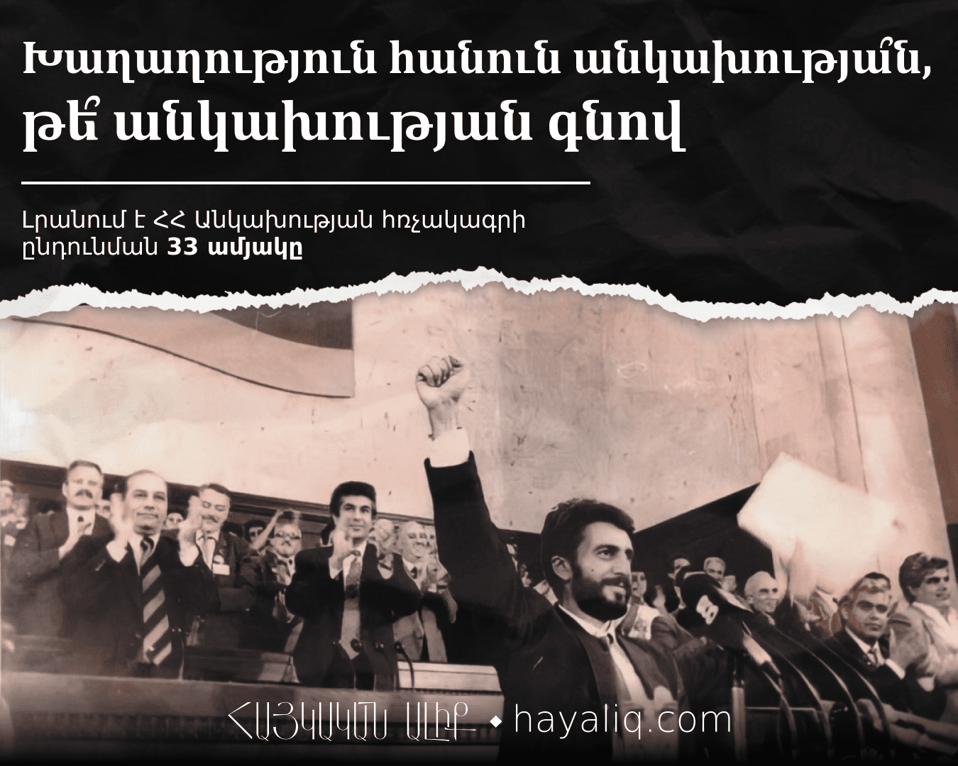 33 տարի առաջ՝ 1990թ-ի օգոստոսի 23-ին, Հայկական ԽՍՀ Գերագույն խորհուրդը ընդունեց ՀՀ Անկախության հռչակագիրը՝ ընտրելով անկախությունը որպես երկրի հետագա զարգացման անշեղ ուղի և սկիզբ դնելով հայոց անկախ պետականության հաստատման իրավական գործընթացին։ Անկախության հռչակագիրը ոչ միայն իր անկախ պետությունը վերականգնելու հայ ժողովրդի դարավոր երազանքի արտահայտությունն էր, այլև նրա երկու հատվածների՝ Հայաստանի ու Արցախի միավորման փաստացի իրողությանը իրավական տեսք տալու փորձ։ Այսօր՝ 33 տարի անց, 2018թ-ին Հայաստանին ու Արցախին պատուհասած հեղափոխության արդյունքում իշխանության եկած ապազգային ուժերի որդեգրած հակապետական, թշնամական օրակարգի ու սկզբունքների պատճառով ՀՀ անկախությունը դարձել է երկիրը դեպի կործանում տանող քաղաքականությունը քողարկելու համար շահարկվող արտահայտություն, իսկ Անկախության հռչակագիրը՝ լոկ փաստաթուղթ։