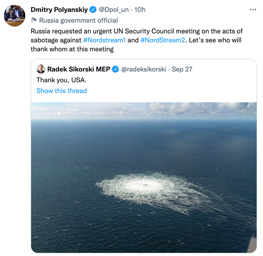 In the background of these cautious and indirect accusations, the former Polish foreign minister, currently the chairman of the EU-US delegation in the European Parliament, Radek Sikorski, stood out, who published a photo of the leak on his Twitter platform, writing “thank you, USA”. Dmitry Polyansky, the Deputy Permanent Representative of the Russian Federation to the United Nations, responded to the post, informing that “Russia has demanded an urgent session of the UN Security Council regarding the sabotage against “Nord Stream 1” and “Nord Stream 2”. Let’s see who will thank whom during this meeting.”