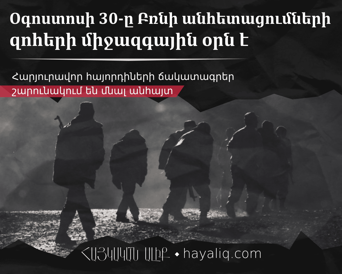 Օգոստոսի 30-ը Բռնի անհետացումների զոհերի միջազգային օրն է: 13 տարի առաջ՝ 2010 թվականին ՄԱԿ-ի Գլխավոր ասամբլեան թիվ 65/209 բանաձևով սահմանեց բռնի անհետացումների զոհերի օրը՝ մտահոգություն հայտնելով «աշխարհի տարբեր հատվածներում բռնի կամ հարկադիր անհետացումների աճով, ներառյալ ձերբակալությունները, կալանավորումներն ու մարդկանց առևանգումները»: Կարևորելով պայքարը բռնի անհետացումների դեմ, այդ թվում՝ այս հանցագործության կանխարգելումն ու անպատժելիության դեմ պայքարը, Հայաստանը 2011 թ.-ին ստորագրել և վավերացրել է «Բռնությամբ անհետացած բոլոր անձանց պաշտպանության մասին» միջազգային կոնվենցիան: