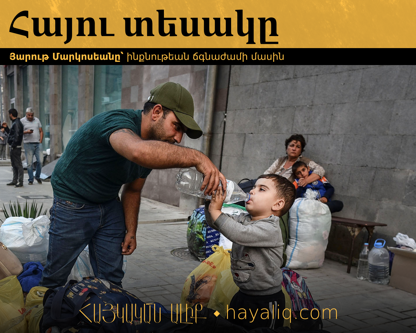Սակայն այս բոլորի կողքին կար նաեւ այլ կեցուածք մը, եւ այստեղ է որ հայու այլ տեսակի շեշտադրումը կը կատարուի։ Այդ բոլոր քաջալերելի նախաձեռնութիւններու կողքին, տեսանք նաեւ անհոգը, ով տակաւին իր կեանքը կը շարունակէ անտարբերութեամբ, որուն կը մտահոգէ միայն թէ ինչ կը կատարուի իր տան չորս պատերուն մէջ։ Բայց աւելի զարհուրելի կեցուածքը, այն դաւաճանական հայացքն է։ Մեր շուրջը գտնուող «հայեր» հաճոյք գտան այս բոլորին մէջ, ըսելով թէ Արցախը յանձնելով խաղաղութիւն պիտի տեսնենք, ըսելով թէ Հայաստանը պարտաւոր չէ պաշտպանելու Արցախի մէջ ապրող հայութեան։