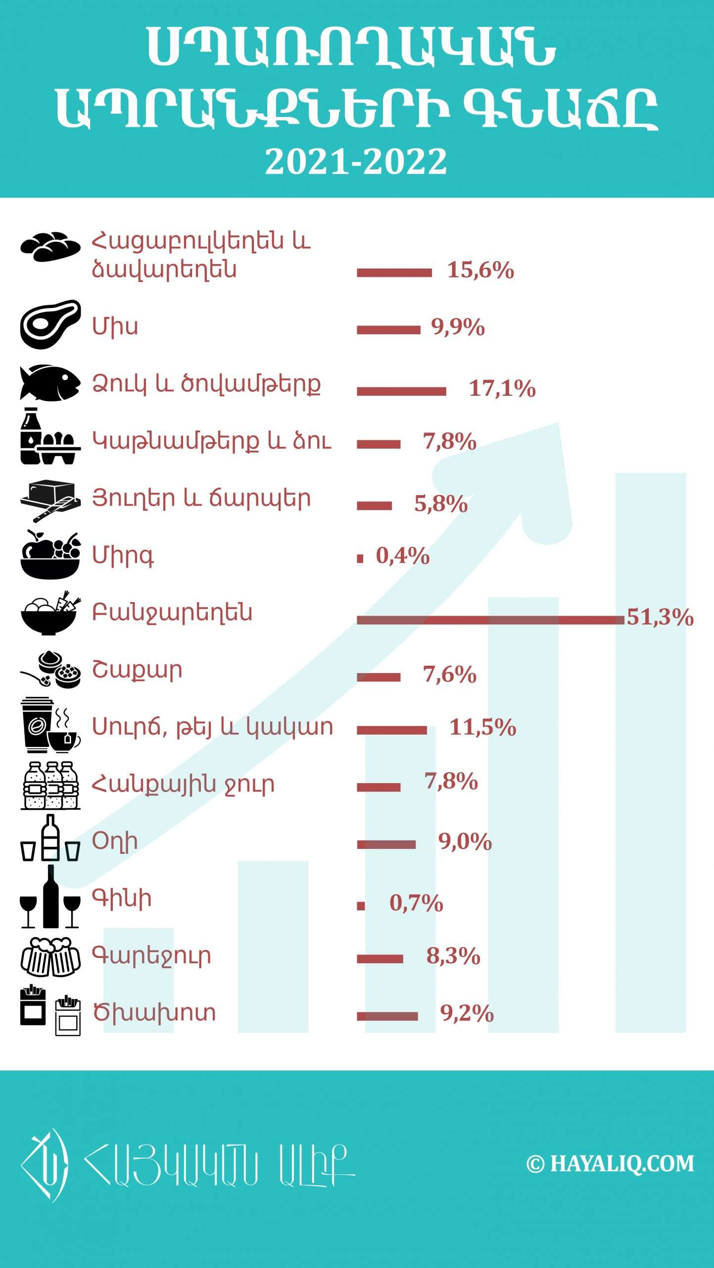 «Հայկական ալիքը» պատրաստել է Հայաստանում վերջին մեկ տարվա ընթացքում սպառողական հիմնական ապրանքների գնաճը պատկերող ինֆոգրաֆիկա։ Բանջարեղենը, ձուկն ու հացաբուլկեղենը գրանցել են ամենամեծ աճը, իսկ առավել քիչ աճ են գրանցել մրգերն ու գինիները։