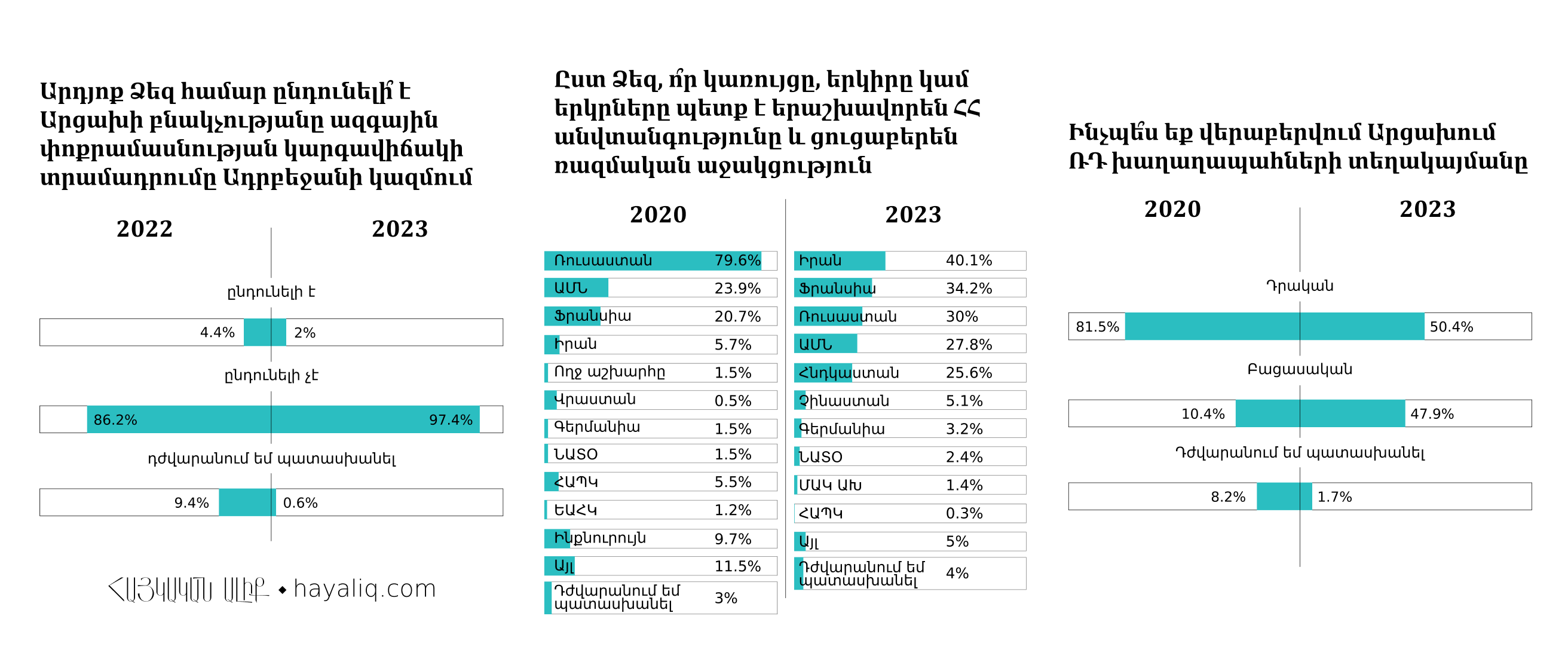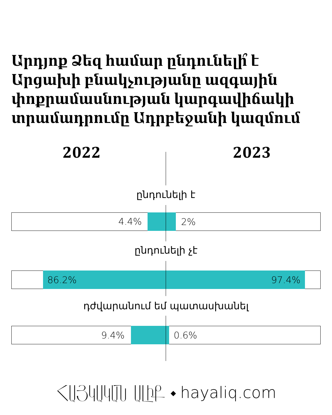 Առաջին գրաֆիկում պատկերված է Արցախի կարգավիճակի մասին հարցման տվյալները: Մասնավորապես, ակնհայտ է, որ «Ընդունելի՞ է, արդյոք, Արցախի բնակչությանը ազգային փոքրամասնության կարգավիճակի տրամադրումը Ադրբեջանի կազմում» հարցին 2022 թ.-ին բացասական պատասխան է տվել բնակչության 86.2%-ը: Այս թիվն աճել է 2023-ին` հասնելով 97.4%-ի: Սա, անշուշտ, դրական միտում է, որը խոսում է մի կարևորագույն բանի մասին. հայ հասարակությունը «հող հանձնող» չէ և պատրաստ չէ հաշտվել Արցախի կորստի հետ: Մինչդեռ, մեզ փորձում են համոզել հակառակը: