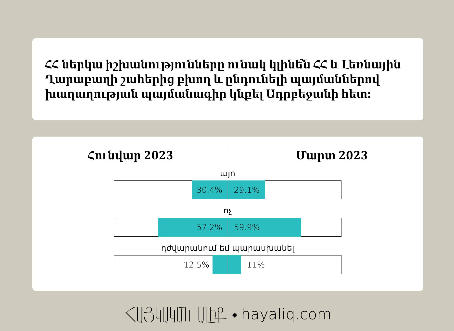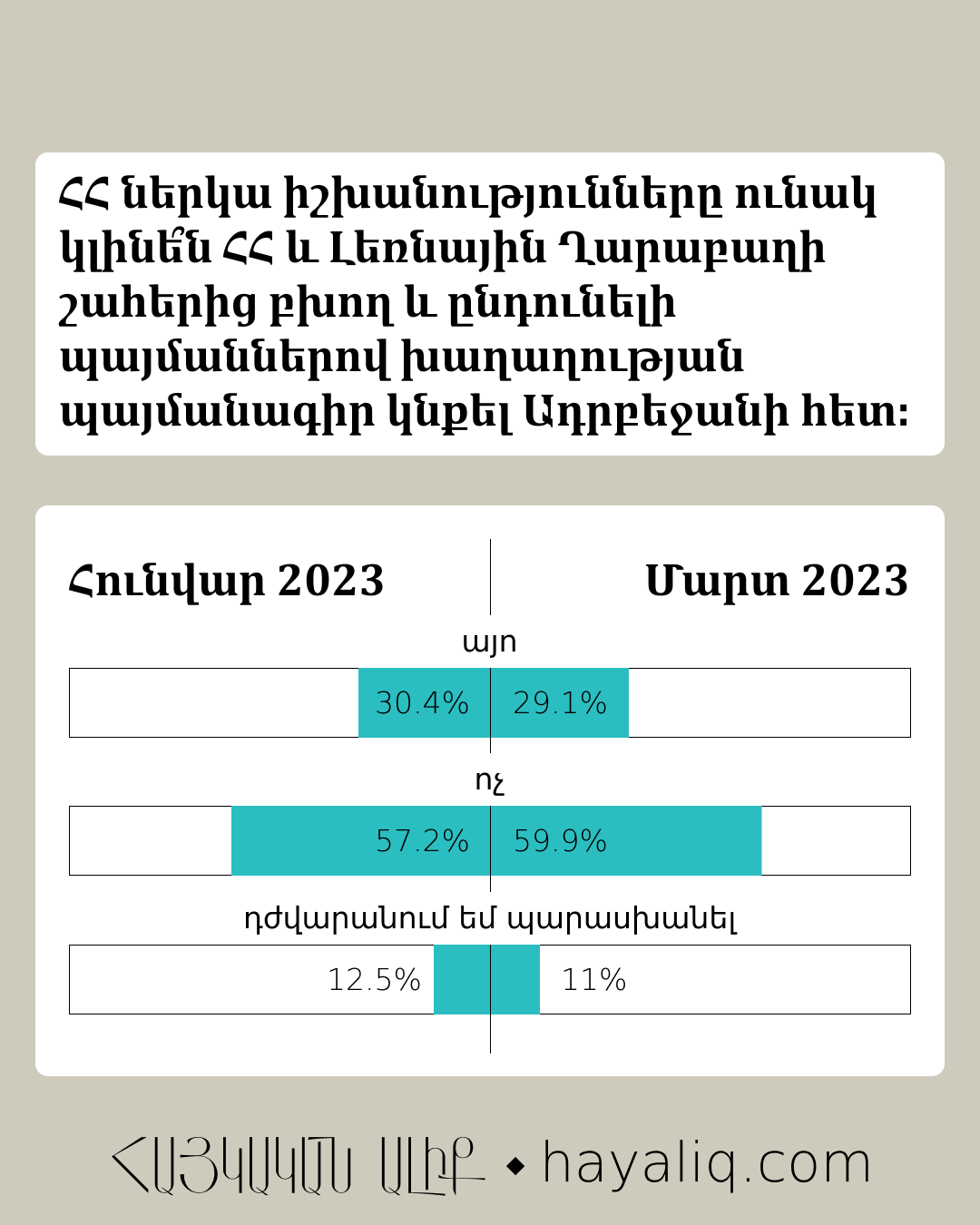Այսպես, հարցին, թե արդյոք դե-ֆակտո իշխանություններն ի վիճակի կլինեն կնքել ՀՀ և ԱՀ շահերից բխող պայմանագիր Ադրբեջանի հետ, այս տարվա հունվարին դրական պատասխան էր տվել բնկաչության 30.4%-ը: Մարտին այս ցուցանիշը նվազել է` հասնելով 29.1%-ի: