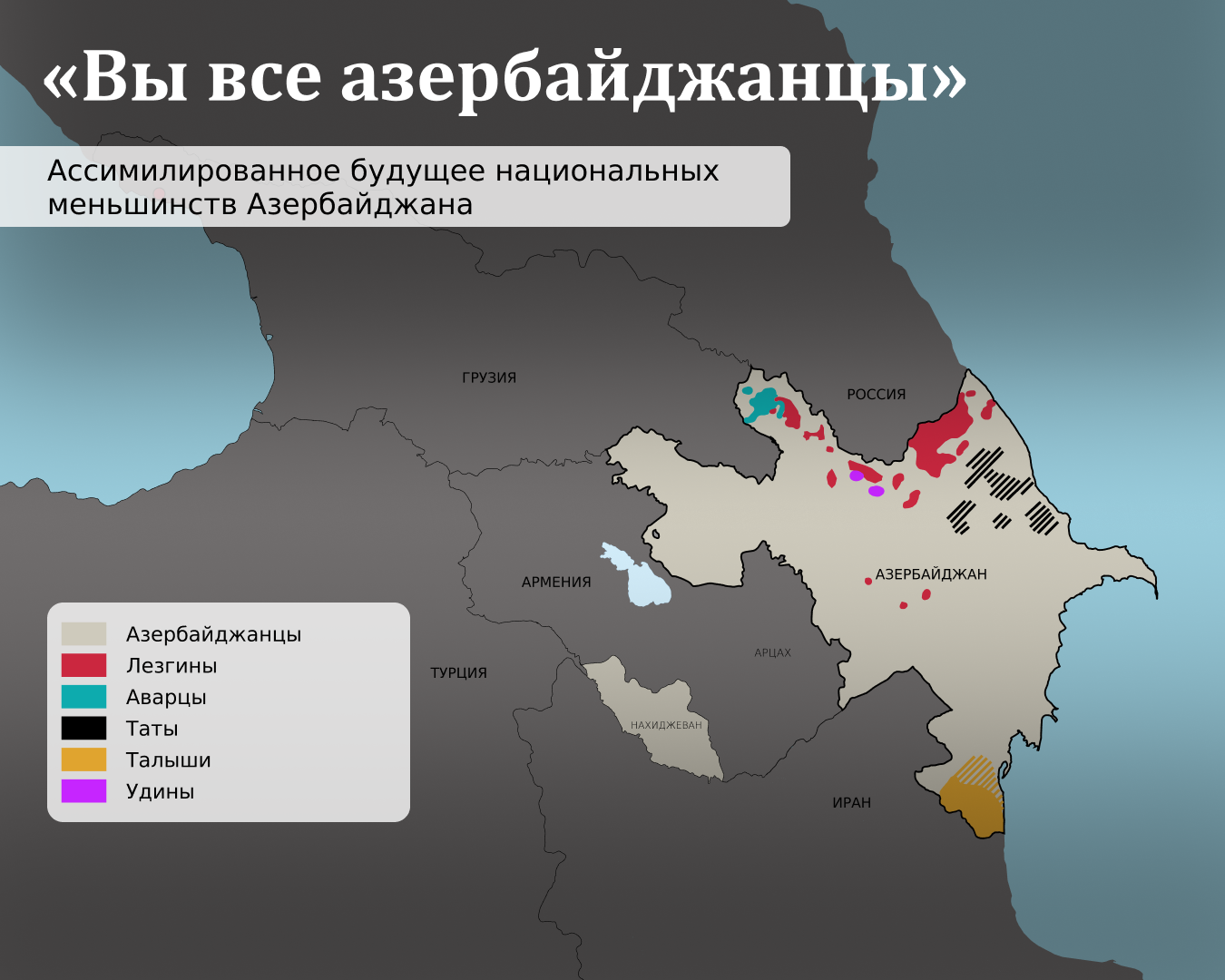 Азербайджанская республика была образована в начале XX века и включала в себя как территории Армении (Нахиджеван, Равнинный и Нагорный Арцах), но и регионы, где компактно проживали другие народы – автохтонные этносы, говорящие на кавказских и индоевропейских языках. На севере исторически проживали лезгины, аварцы и удины, а юге – талыши, а на Апшероне – таты. Эти народы кардинально отличаются от азери-тюрок не только происхождением и языком, но и религией – кавказские народности традиционно являются суннитами, в отличие от азербайджанцев-шиитов.