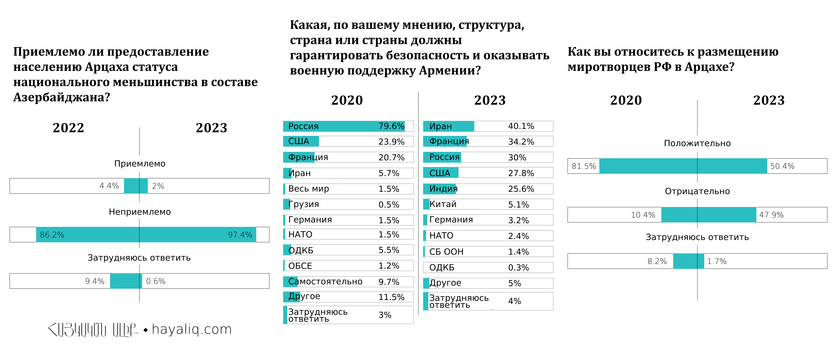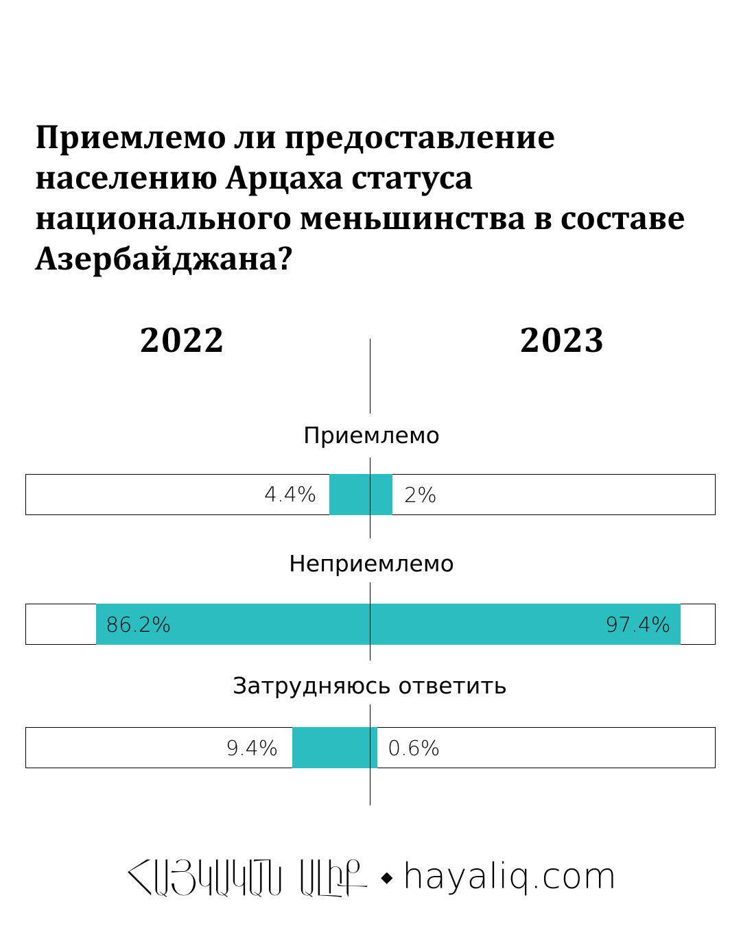 В частности, очевидно, что на вопрос «Приемлемо ли предоставление населению Арцаха статуса национального меньшинства в составе Азербайджана?» в 2022 году отрицательный ответ дали 86,2% населения. В 2023 году это число выросло до 97,4%. Это, безусловно, положительная тенденция, которая говорит о важном: армянское общество не «сдает земли» и не готово смириться с потерей Арцаха. Между тем нас пытаются убедить в обратном.
