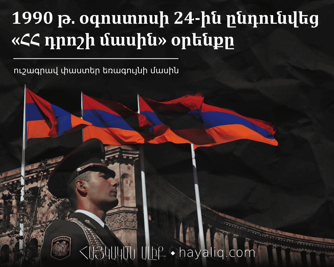 ՀՀ Գերագույն խորհուրդը 1990 թվականի օգոստոսի 24-ին ընդունեց «ՀՀ դրոշի մասին» օրենքը։ Նորանկախ Հայաստանը իր անկախության խորհրդանիշները, այդ թվում` դրոշը, վերցրել է Առաջին Հանրապետությունից։ Եռագույնը՝ որպես Առաջին Հանրապետության դրոշ, առաջին անգամ բարձրացվել է 1918թ.-ի օգոստոսի 1-ին, երբ Երևանում բացվում է առաջին խորհրդարանի՝ Հայաստանի խորհրդի առաջին նստաշրջանը։