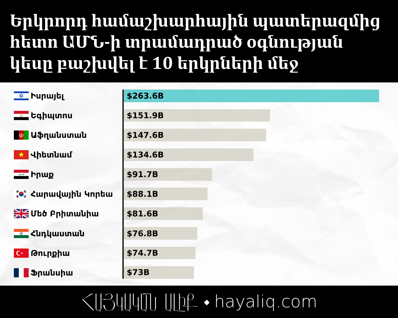 ԱՄՆ-ի արտաքին օգնության ամենախոշոր ստացողն Իսրայելն է։ 1946 – 2023 թվականների ընթացքում ընդհանուր ծավալը կազմել է մոտ 263 մլրդ դոլար։